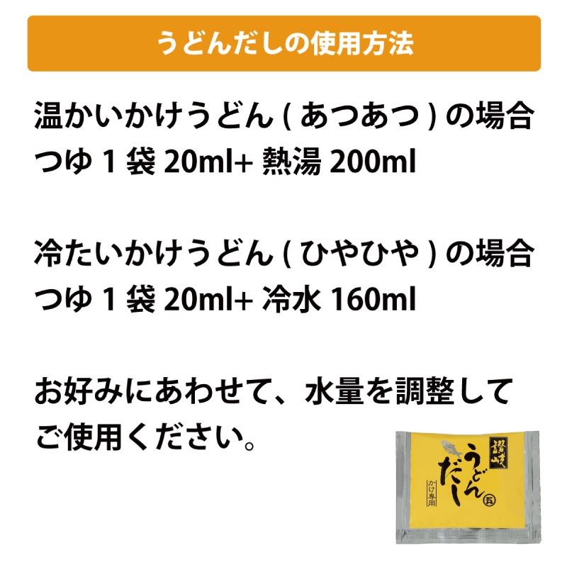 温かいかけうどん(あつあつ)の場合: つゆ 20mlに対して熱湯200mlで希釈。 冷たいかけうどん(ひやひや)の場合: つゆ 20mlに対して冷水160mlで希釈。 お好みにあわせて、湯(水)量を調整してご使用ください。 |