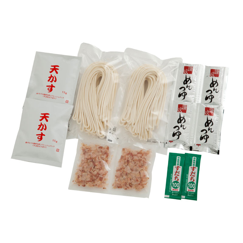 【4人前】 ・半生うどん220g(2人前)×2 ・めんつゆ20ml×4 ・かつおぶし、天かす、すだち果汁 |