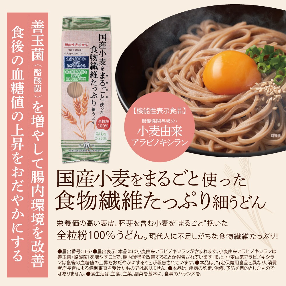 おいしくて、カラダにも嬉しい! 食物繊維たっぷり全粒粉100%うどん。 栄養価の高い表皮、胚芽を含む国産小麦を"まるごと"挽いた全粒粉100%を使ったうどんが完成。 長年培った製麺技術を活かし、ぼそぼそしがちな全粒粉麺をつるっとした食感に仕上げました。食べやすく、アレンジもしやすい麺です。手軽においしく健康を意識できます。健康が気になり始めたあなたにおすすめの麺です。 〈全粒粉100%〉国産小麦をまるごと使った食物繊維たっぷり細うどん 【機能性表示食品】小麦由来アラビノキシラン 善玉菌(酪酸菌)を増やして腸内環境を改善。食後の血糖値の上昇をおだやかにする。 ●届出番号:I667 ●届出表示:本品には小麦由来アラビノキシランが含まれます。小麦由来アラビノキシランは善玉菌(酪酸菌)を増やすことで、腸内環境を改善することが報告されています。また、小麦由来アラビノキシランは食後の血糖値の上昇をおだやかにすることが報告されています。●本品は、特定保健用食品と異なり、消費者庁長官による個別審査を受けたものではありません。●本品は、疾病の診断、治療、予防を目的としたものではありません。●食生活は、主食、主菜、副菜を基本に、食事のバランスを。 |