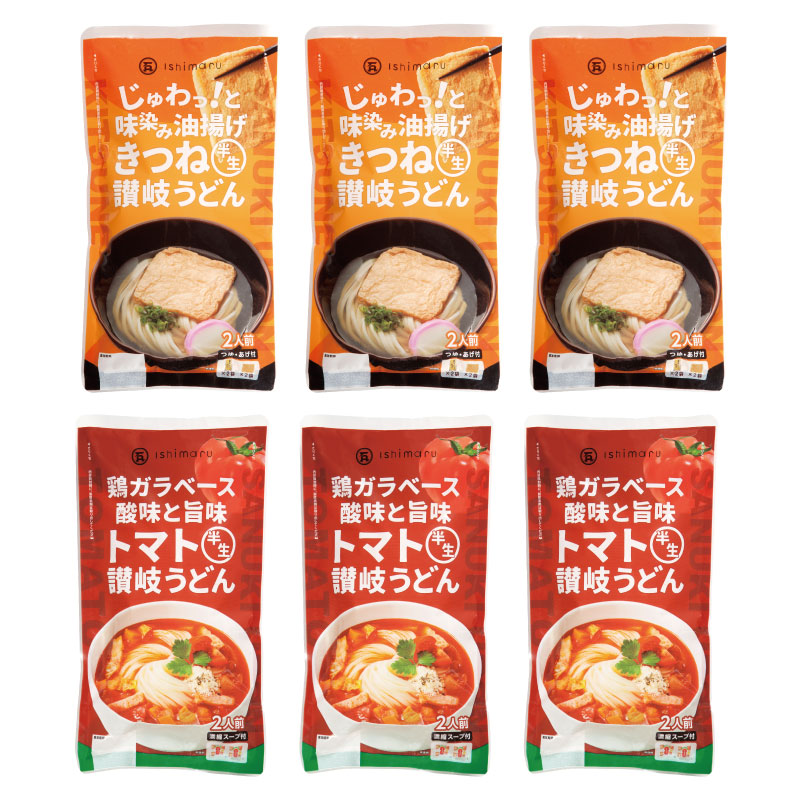 【12人前】 きつねうどん〔半生うどん220g×1、うどんだし20mL×2、あげ35g×2〕×3、トマトうどん〔半生うどん220g×1、 トマトスープ50g×2〕×3 |