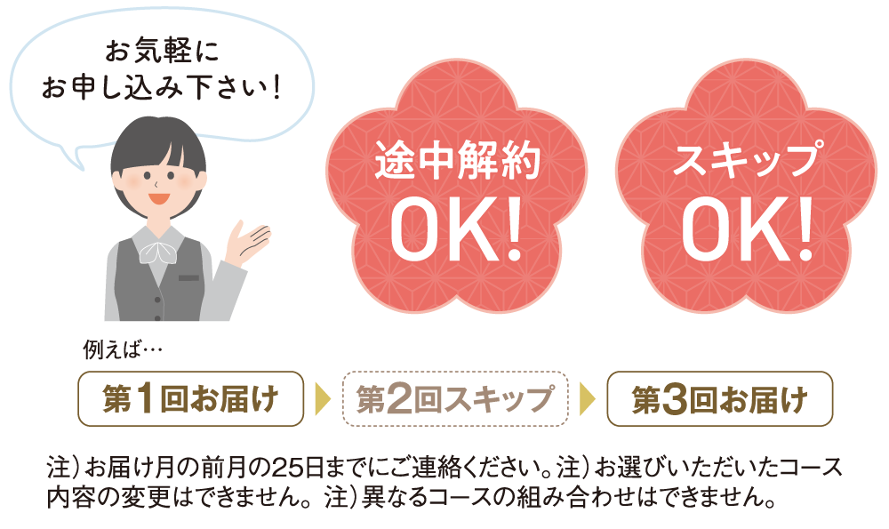 ●商品のキャンセル・変更などがございましたら、お届け月の前月の25日までにご連絡ください。 (例えば、5月お届け分の変更は、4月25日までにご連絡ください。)